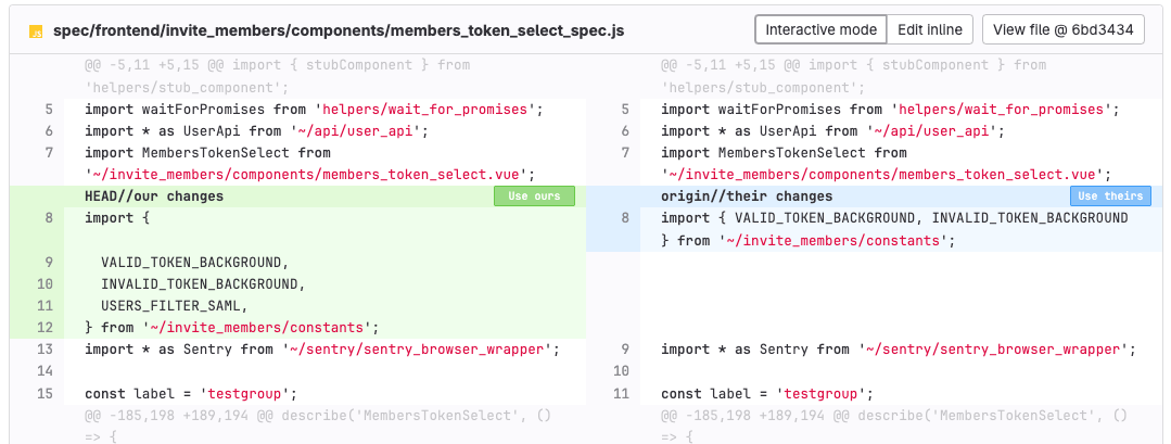 The merge conflict resolution editor helps you resolve these conflicts in GitLab: