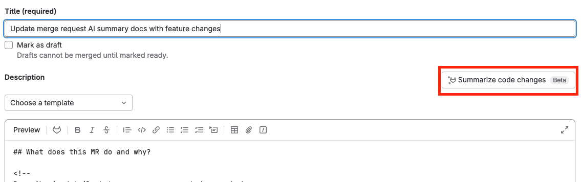 When you create or edit a merge request, use GitLab Duo Merge Request Summary to create a merge request description.
